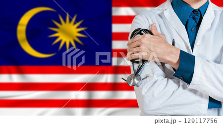 Doctor with stethoscope on Malaysia flag. Doctor holding stethoscope on Malaysia flag