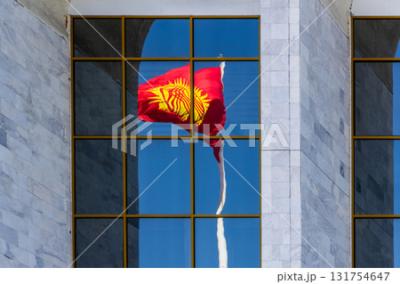 Waving National Flag of Kyrgyzstan reflected in building window under blue sky