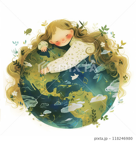 Earth day A girl is sleeping on a globe with a green and blue background. The globe is surrounded by trees and flowers