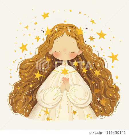 ZODIAC SIGN VIRGO A girl with long hair is surrounded by a lot of stars. She is praying and looking up at the stars