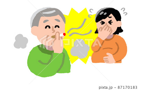 タバコを吸うシニア男性と嫌がる妊婦(手描きカラー)