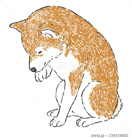 座って毛づくろいしている手書きの柴犬のイラスト