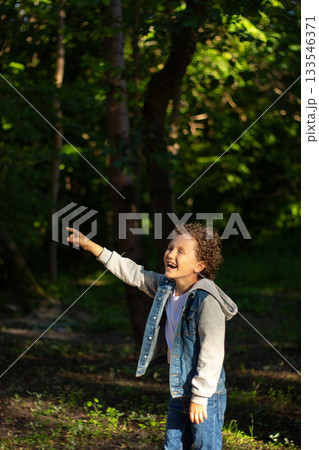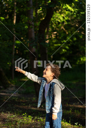 Child boy standing outdoors on summer sunny day enjoying warm weather outside. Rest and wellness concept.