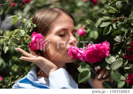 Woman Roses Perfume: Brunette inhales rose scent in garden, summer day, enjoying flora fragrance.