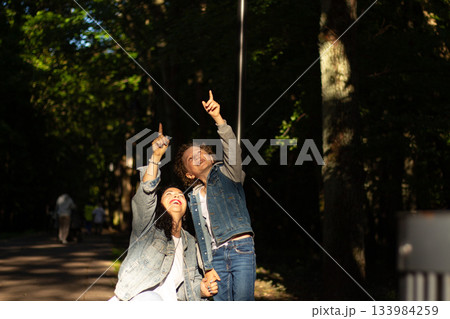 Curious boy and his mom stand under tree, gazing up with awe at birds nest. This image embodies innocence and the simple childhood joy of exploring outdoors
