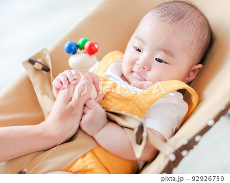 ガラガラに興味を示す赤ちゃん ママの手を掴む ファーストトイ 木の玩具 聴覚、色覚の発達 追視