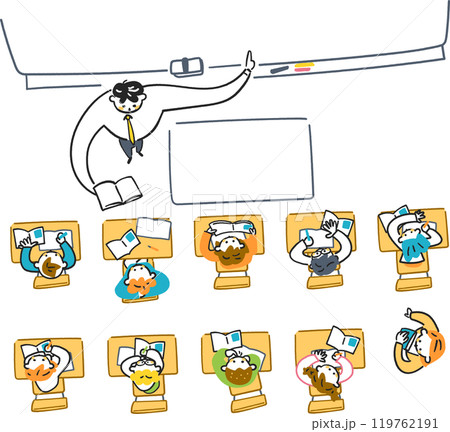 小学校の授業風景 熱心に授業を聞く生徒たち 俯瞰図 ストックイラスト素材