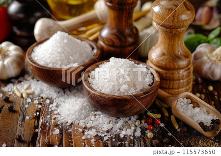 Salt in a bowl on a wooden background. Selective focus.