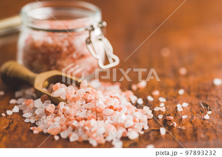 Pink himalayan salt on wooden table.