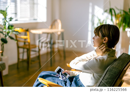 ソファに腕を置き、眼鏡を見つめる女性