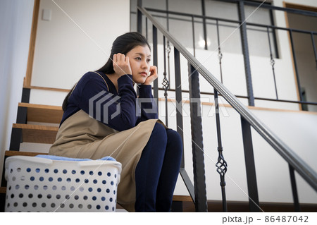 家事に疲れる主婦イメージ・階段で洗濯かごの前で悩む女性