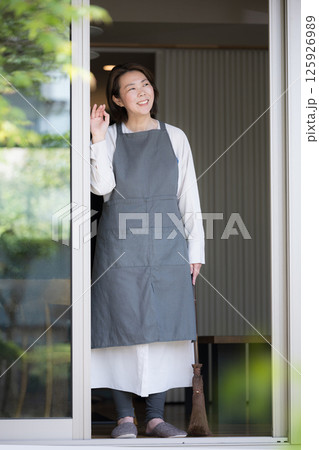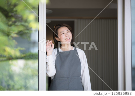 窓から外を眺める主婦のようなエプロンを付けた女性 ライフスタイルやセカンドライフ
