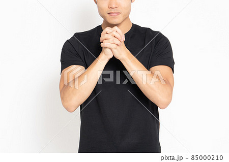 アキバ系の男性 合掌して祈る 白背景 カメラ目線