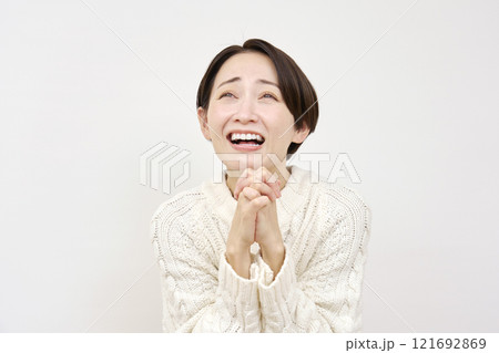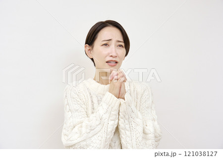 女性 ミドルエイジ 懇願する 合掌 白背景