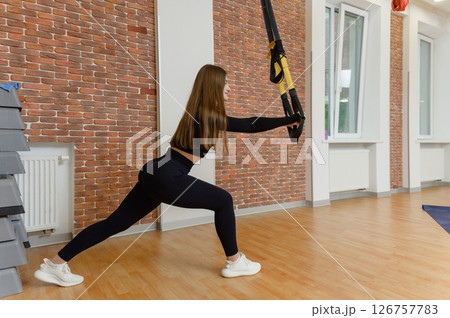 Young woman in sports clothing training with trx fitness straps in the gym.