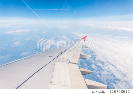 View from the airplane window at a beautiful cloudy sky and the airplane wing