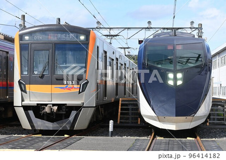 車両基地で並ぶ京成電鉄3100形とスカイライナーのAE形