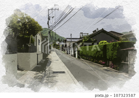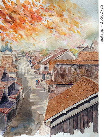 水彩画風 吹屋ふるさと村 吹屋の町並み 岡山県高梁市