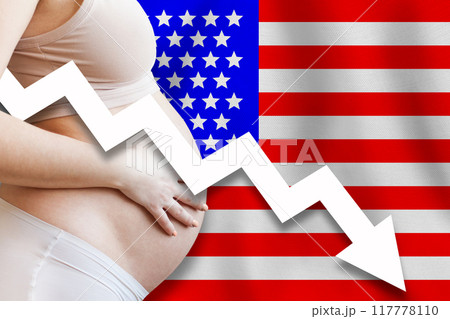 US Falling birth rates. Attractive pregnant woman belly against American flag background.