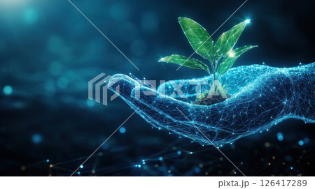 Digital hand holding seedling, sustainable future concept, glowing network background