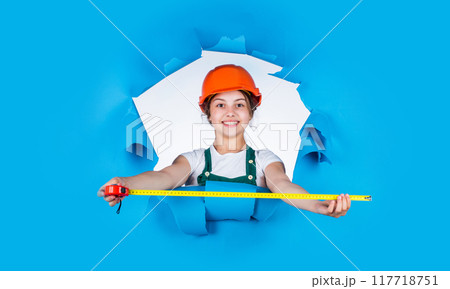 Trust me I am an expert. playing with tools. growing concept. little girl with measuring tape. instruments for renovation apartment. childhood happiness and development. measuring height. architect