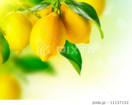 Yellow citrus lemon fruits and green leaves in the garden. Citrus lemon growing on a tree branch close-up.15