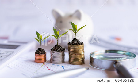 Piggy and the tree growing on money coin stack for investment