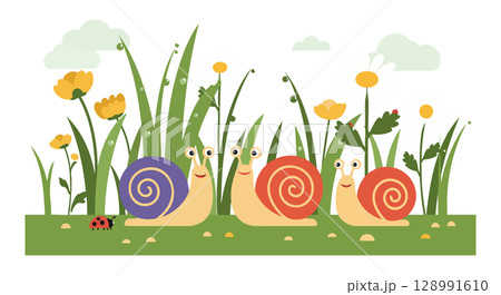 Snails with colorful shells in green grass and wildflowers vector illustration