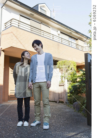 マイホームをバックにした若い夫婦のポートレート