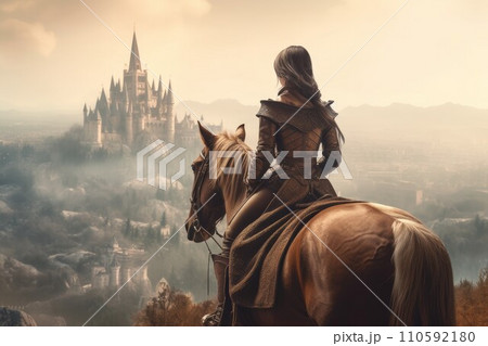 AI-generated content. Medieval knight woman. Horse riding. Generate Ai