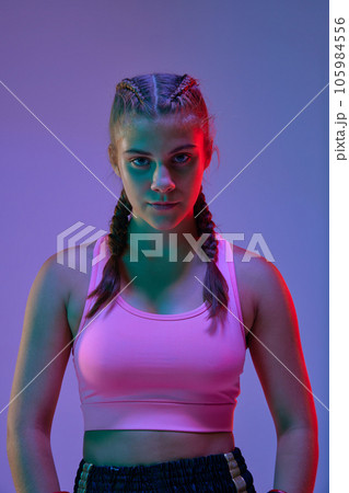 Portrait of sportive teen girl, athlete in sportswear, looking at camera against purple studio background in neon lights