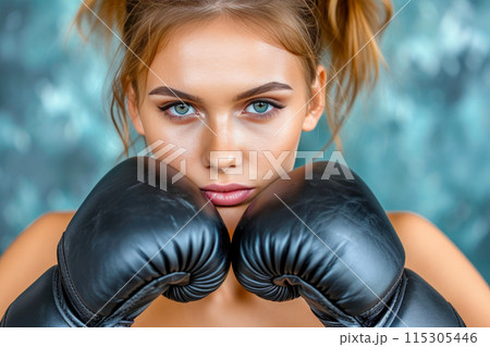 determined female boxer with wet hair stands ready under bright sky, wearing red boxing gloves and sports bra, showcasing strength and focus