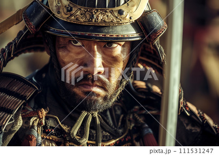 強烈な視線の鬼侍のポートレート、抽象的なインクと水墨画アート