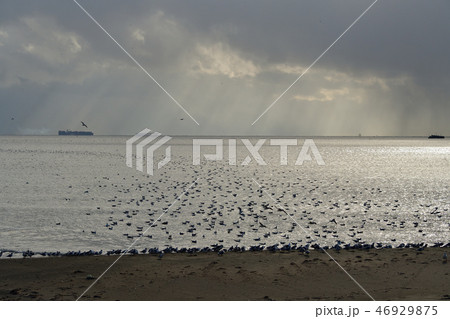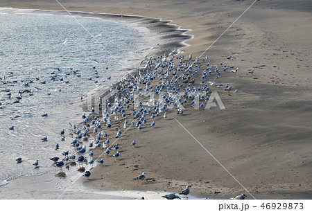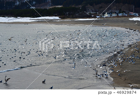 冬の北海道函館市戸井海岸で海鳥の群れが戯れている風景を撮影