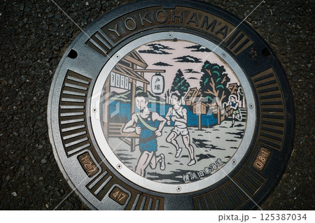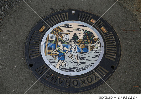 東海道五十三次戸塚宿と箱根駅伝のデザインされているマンホール