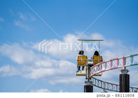 名古屋市港区 戸田川緑地公園の遊具に乗って春の休日を楽しむ親子