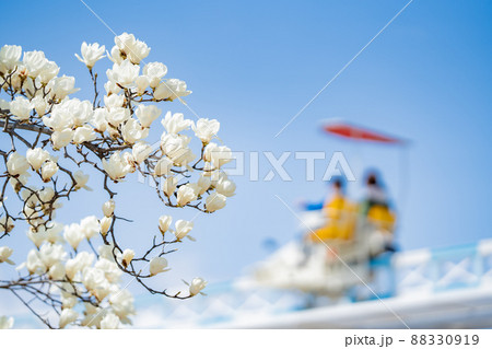 名古屋市港区 ハクモクレンの美しい戸田川緑地公園の遊具に乗って春の休日を楽しむ親子