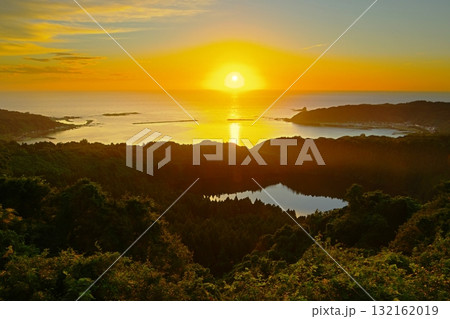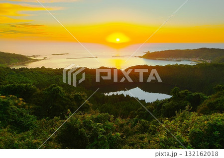 秋田県男鹿半島の二ノ目潟と戸賀湾を望む八望台から見た日本海に沈みゆく夕陽の風景 Ver1