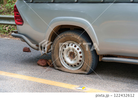 Truck carrying overloaded produce suffered tire blowout while parked on rural highway