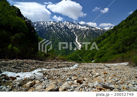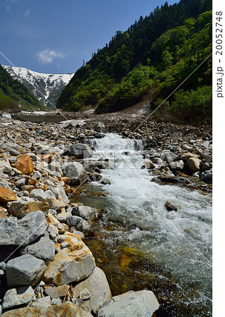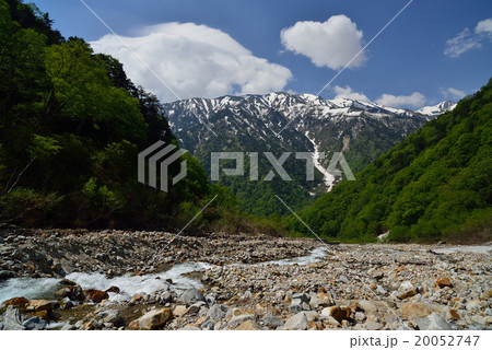 扇沢風景 新緑と渓流と残雪の北アルプス