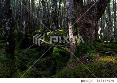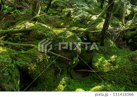 大台ヶ原で見た苔むした岩と新緑の深い森 木漏れ日が差し込む神秘的な自然風景