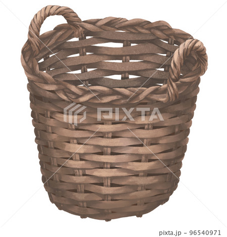 Watercolor empty wicker basket with handle illustration on isolated background. Hand painted woven basket, rustic element for organic grocery packaging, picnic or harvest festival invitations