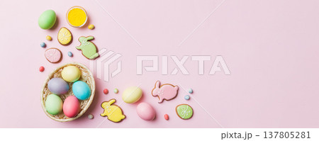 holiday preparation Multi colors Easter eggs with cookies on colored background . Pastel color Easter eggs. holiday concept with copy space