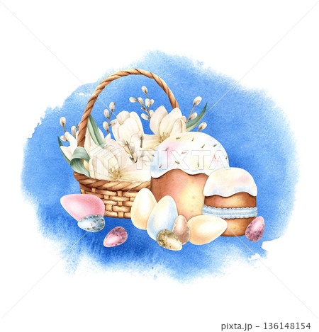 Easter bright composition wicker basket, spring primrose, icing cake, colorful eggs, willow branches. Symbol of rebirth and holiday. Hand drawn illustration isolated on blue watercolor stain