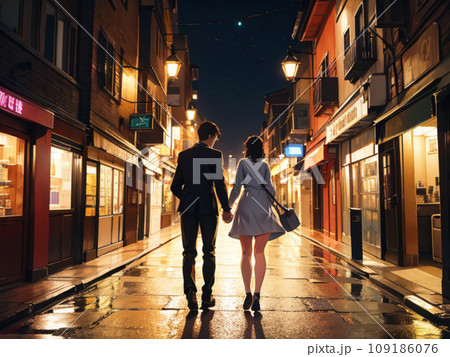 手をつないで夜の街を歩く若いカップルの後ろ姿(AI画像)