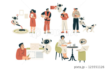 Artificial Intelligence Technology with People Character Interacting with Smart Bot Vector Set