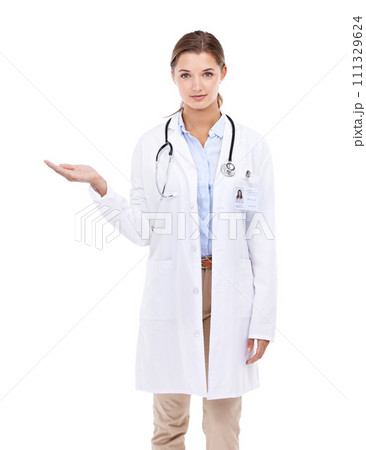 Palm of woman, advertising or portrait of doctor with mockup space isolated on white background. Help, offer or hand of nurse in studio to show medical healthcare information, service or advice