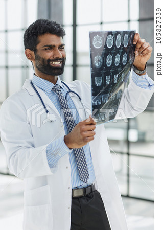 A futuristic doctor shows stethoscope and appear of advanced futuristic medicine symbols in holography.