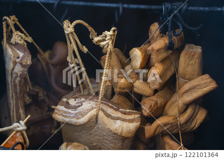 Delicious thin smoked hunting sausages with salt, spices and herbs