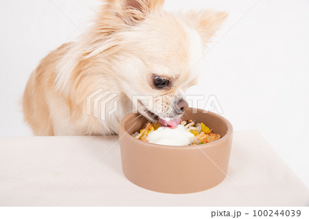 クリームのチワワが犬用ヨーグルトがかかった手作りご飯を食べるところ